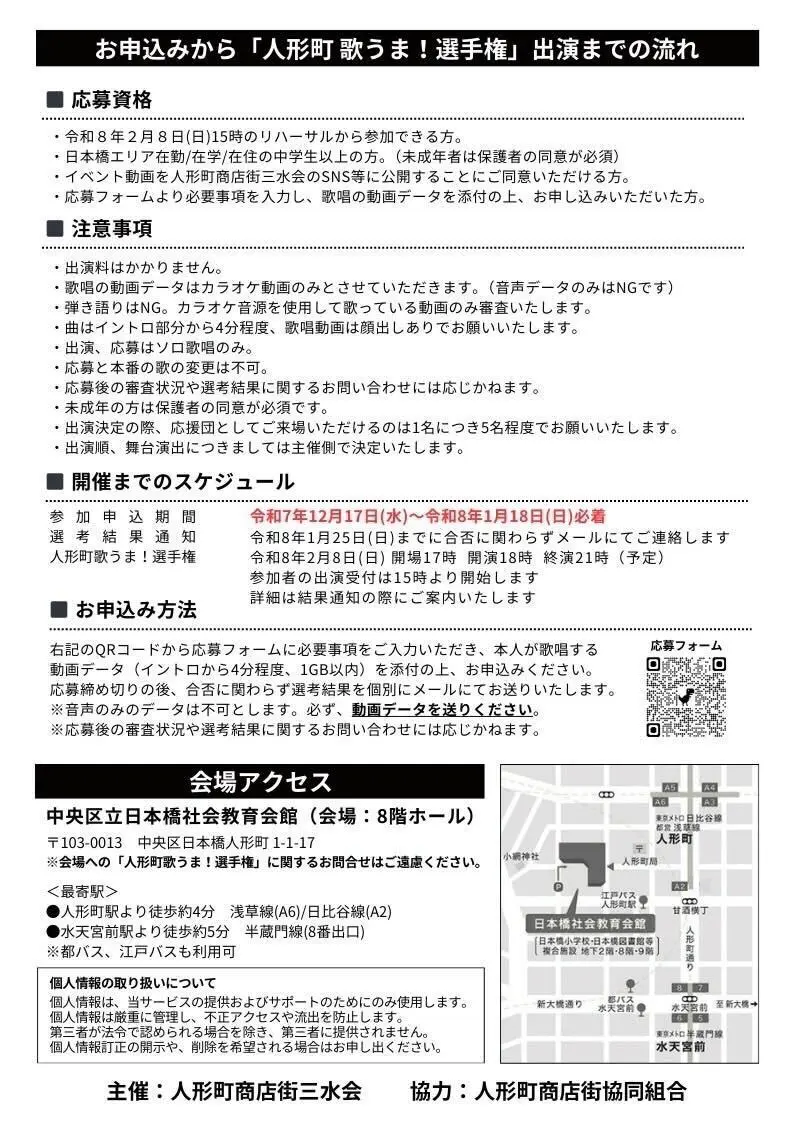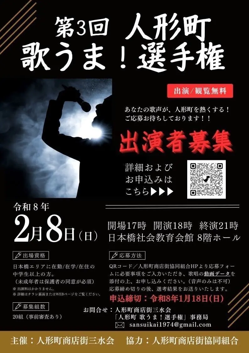 問合せ先:人形町商店街三水会「人形町 歌うま!選手権」事務局 ✉sansuikai1974@gmail.com |